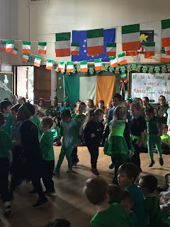During the month of March we celebrated Saint Patricks day. We made shamrock headbands and learned a special Irish Dance for the annual Ceili that is held in Scoil Mhuire every year. Here are some pictures of us practicing our dance in the hall and ones of the actual Ceili!